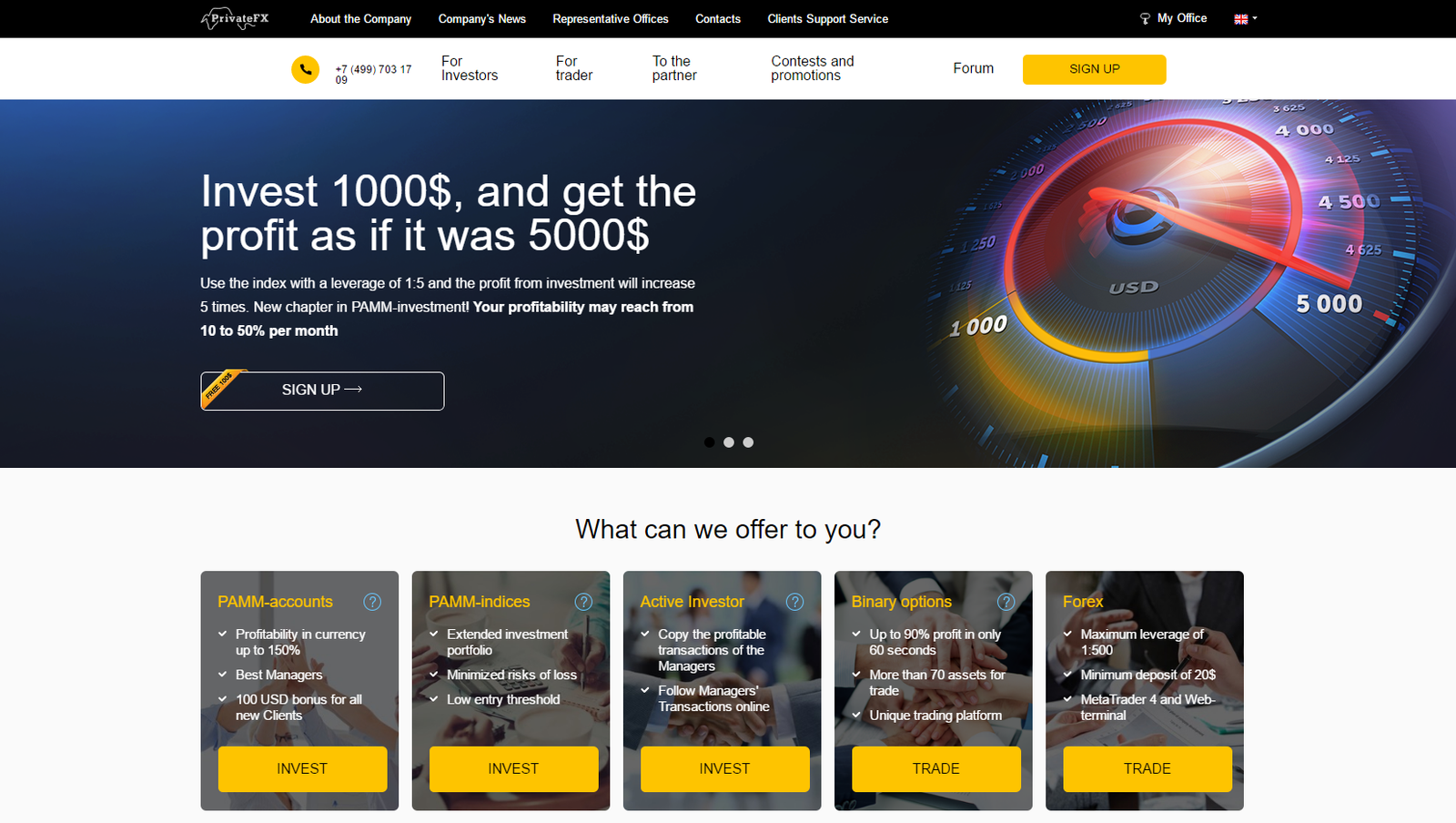 On-line since: About company: PrivateFX was founded in 2015. One of the largest investment companies Concorde Capital, which is owned by well-known Ukrainian businessman Igor Mazepa, supported opening and development of the broker. Some of PrivateFX clients came from bankrupted ForexTrend as the broker developed special program 1+1 that allowed to transfer the remaining funds from ForexTrend accounts to PrivateFX. In addition, the broker offers its clients to trade binary options. All you need to do is to choose an asset, predict the trend – up or down – and select the amount of investment. The operation takes 30 seconds. Profit from the successful transaction is up to 80%. The company's website states that PrivateFX is included in the top three companies in the CIS with the biggest PAMM system's capital of over $20,000,000. The company works with more than eight thousand clients, including such celebrities as Pavel Bure. The broker was awarded with the following titles: