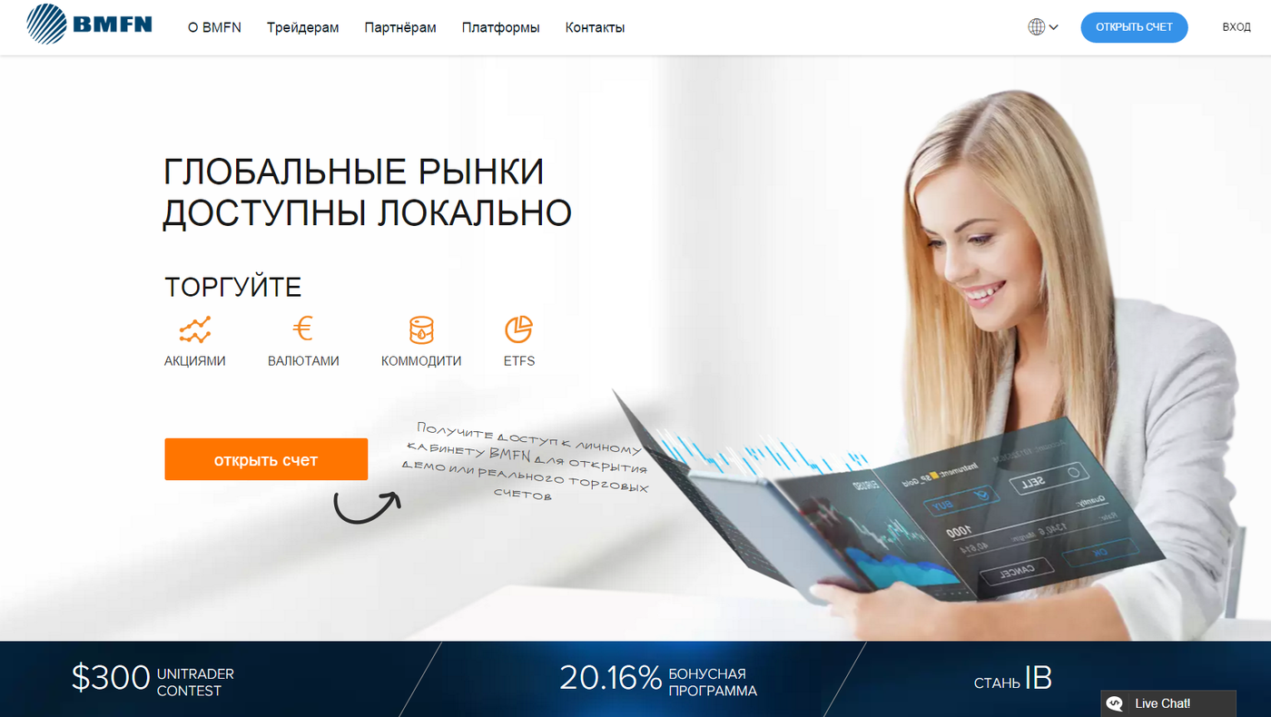 В он-лайне с: О компании: Брокер Boston Merchant Financial (BMFN) является частью холдинга Boston Merchant Financial Group. Компания имеет множество представительств по всему миру – от Соединенных Штатов Америки до Австралии. Брокер предлагает своим клиентам такие услуги, как автоматическая торговля, PAMM-система, система доверительного управления FXMA, позволяющая клиентам диверсифицировать риски при инвестировании капитала на Форекс. Кроме того, в компании действует партнерская программа. Трейдеры BMFN получают доступ к торговле акциями, фондовыми индексами, сырьевыми товарами и драгоценными металлами. Трейдинг ведется на нескольких торговых платформах: MT4, BMF Pro, BMF Currenex и UniTrader.
